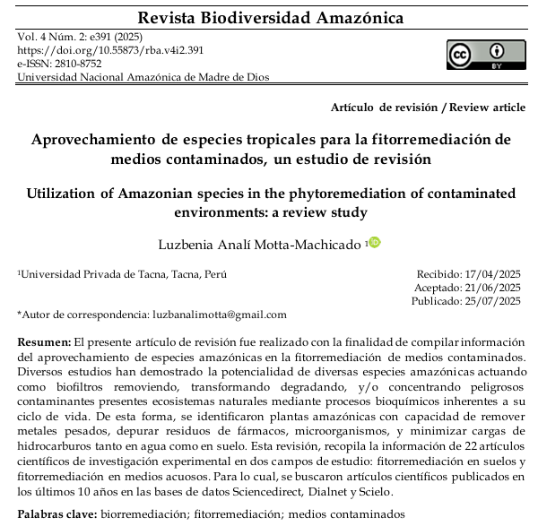 La Revista Biodiversidad Amazónica (e-ISSN: 2810-8752) es publicación científica arbitrada, disciplinaria, de acceso abierto, patrocinada por el Vicerrectorado de Investigación y editada por la Dirección de Institutos de Investigación en coordinación con el Instituto de Investigación de Recursos Naturales y Medio Ambiente de la Universidad Nacional Amazónica de Madre de Dios, Puerto Maldonado, Perú; tiene una periodicidad de publicación semestral (enero-junio y julio-diciembre), en su versión Online.